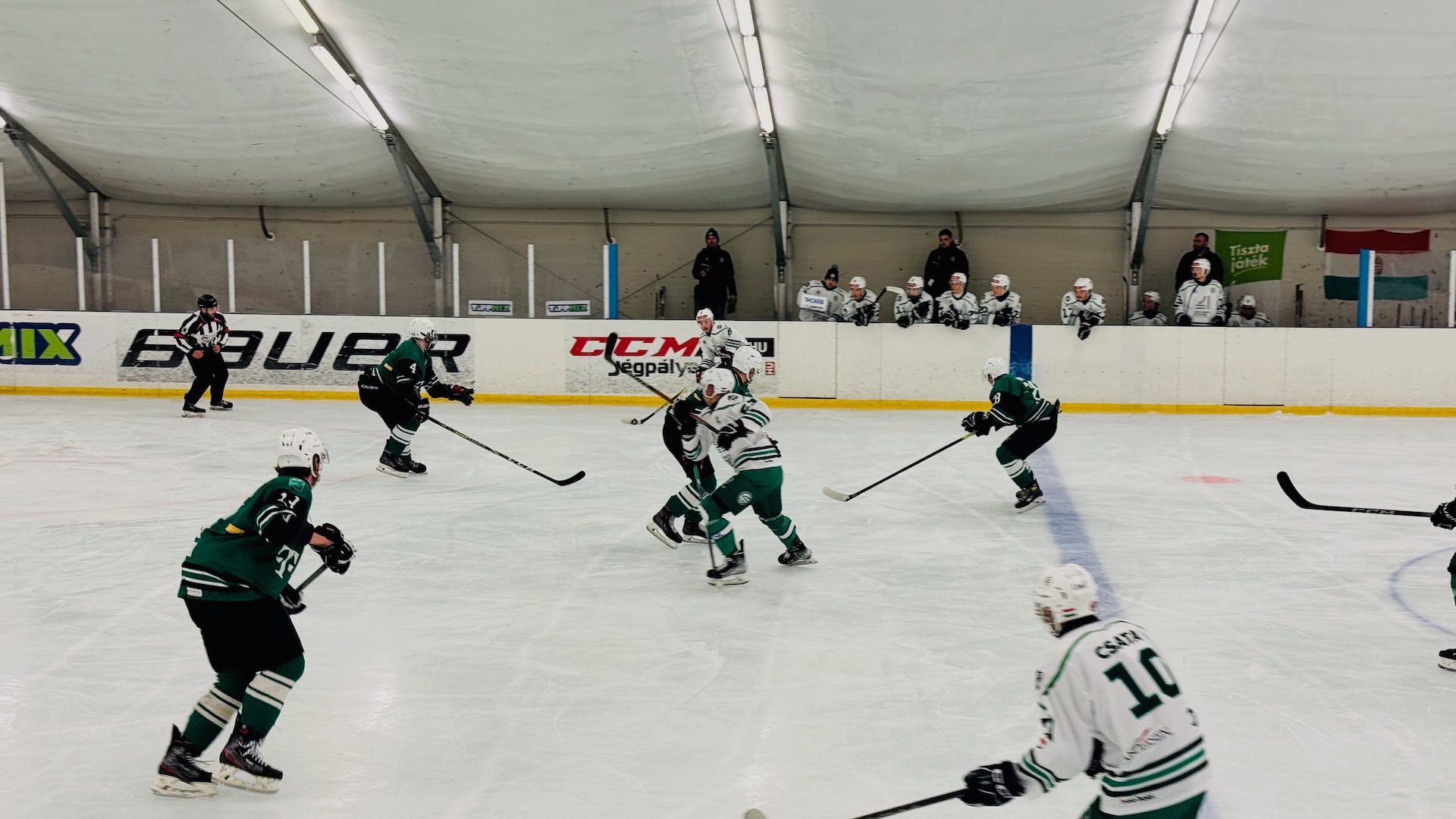 A mérkőzés első pillanatai igazi meglepetést hoztak: a középkezdést követően rögtön elvesztettük a korongot, és mindössze négy másodperc elteltével Kocsis (#12) révén máris megszerezte a vezetést a hazai együttes. Az egyik leggyorsabb gól az Andersen Liga történetében azonban nem törte meg a lendületünket: gyorsan rendeztük sorainkat, és átvettük a játék irányítását. A nyomásnak hamar meglett az eredménye: előbb Csata Sebestyén (#10), majd Sipák Dominik (#77) volt eredményes, így már az első harmad után fordítottunk.